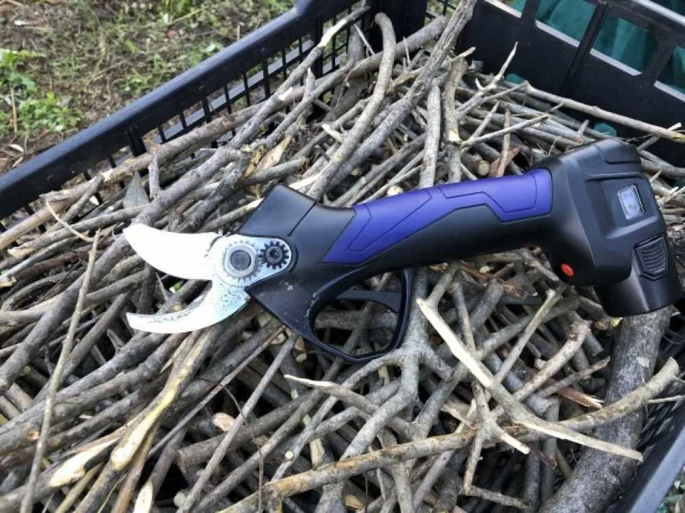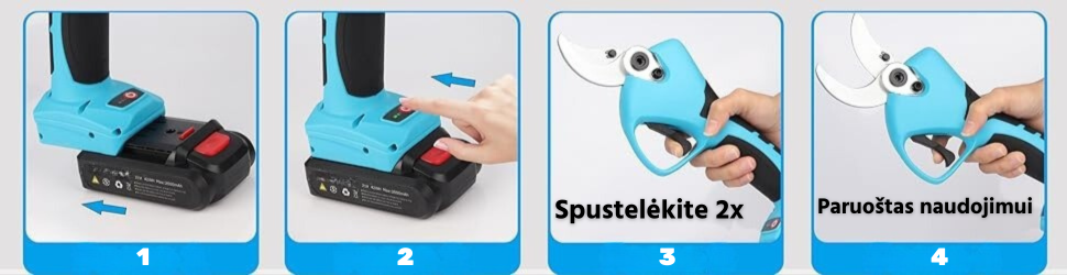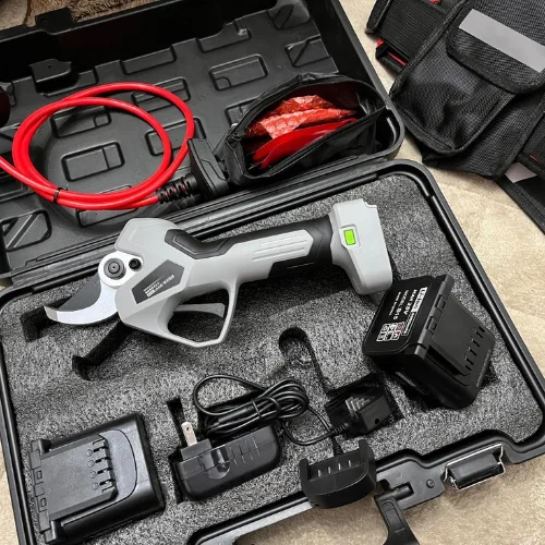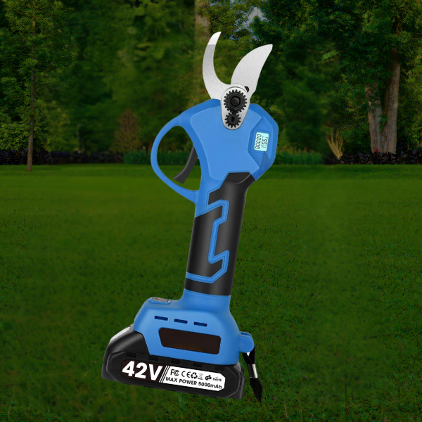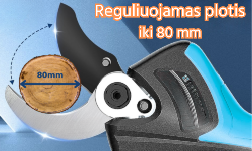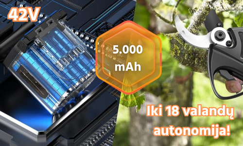 1050 W elektrinės žirklės su reguliuojamu greičiu ir dviem 42 V-5 000 mAh akumuliatoriais.