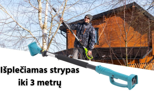 Į kainą įeina: teleskopinė lazda, ištiesiama iki 3 m, 2 x 5000 mAh baterijos, įkrovimo laidas, dėklas su laidu ir 10 000 mAh maitinimo baterija, reguliavimo raktas ir atsuktuvas, tepimo alyva, 2 atsarginės geležtės, nešiojamas dėklas.